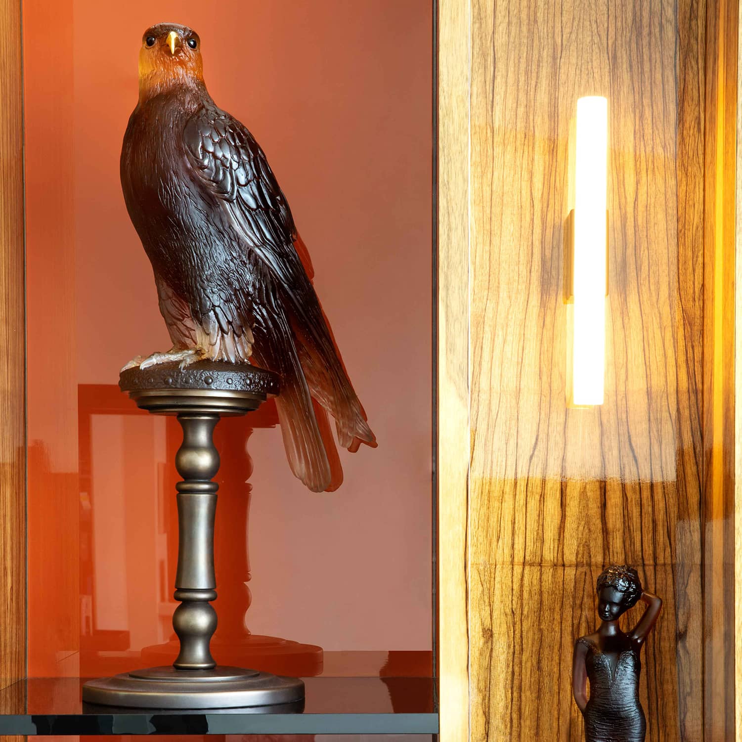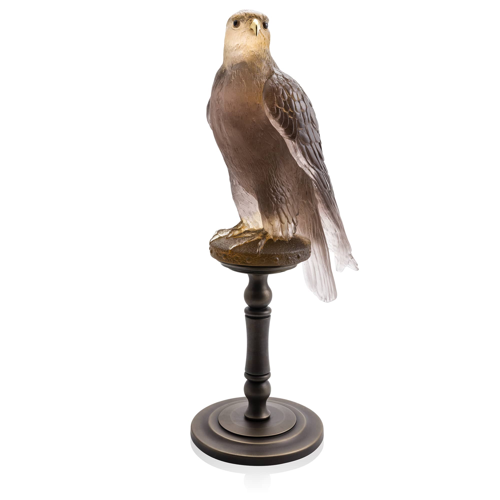 Since 2011, the artist has embarked on a journey with the Maison Daum, debuting with the Faucon Saker crystal piece. This year, the story continues with the re-edition of the Gyrfalcon Hawk in warm shades of amber, grey and pink. The Animal Art collection at Daum expands with the addition of this magnificent bird of prey in a realist style that makes a reference to the art of falconry. Perched on a beautifully patinated bronze base, the almighty hawk is adorned with jet-black obsidian stones and a gilded beak in 24k gold. The meticulous detail of the sculpture is yet another testament of the incredible talent of the Daum craftsmen.