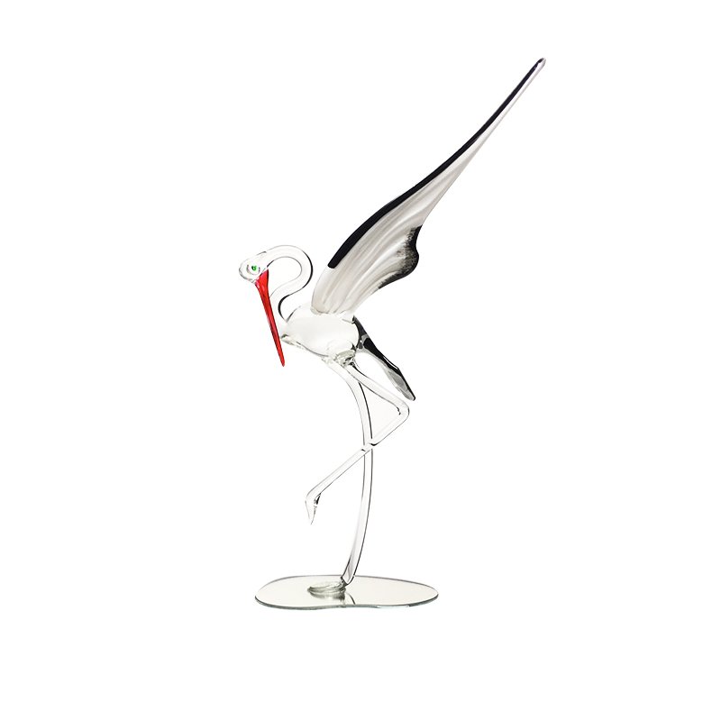 CRYSTAL SCULPTURE STORK ON MIRROR, Of amazing finesse, this stork give an impression in movement, she is performed by a glass craftsman, then painted by hand. Symbol of Alsace, a collector sculpture to contemplate.