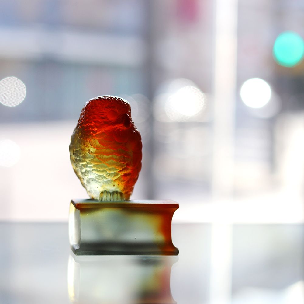 Daum France presents a new color for this amazing book owl. The finesse of the details makes this sculpture in living crystal paste. The power of amber mingles with the contrasts of green, a poetry of color harmoniously arranged. A very beautiful piece symbol of wisdom.