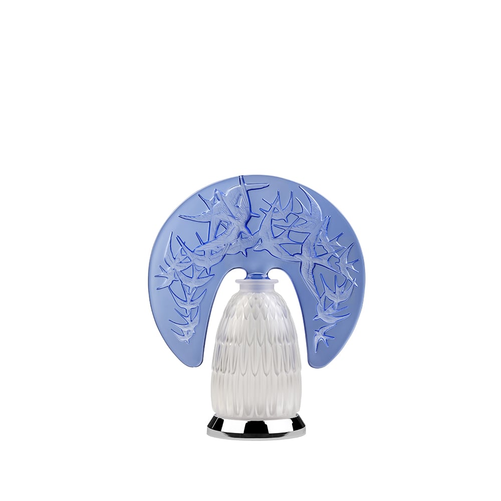 Discover the blue Swallows lamp Lalique. Celebrating the 130th anniversary of the Maison, the new collection takes us to the heart of the immeasurable heritage built by its founder. Through his work, René Lalique explored the decorative possibilities of flora, fauna and the female form. Among fauna, the swallow particularly inspired him, which he then made the centrepiece of many jewels and decorative objects.