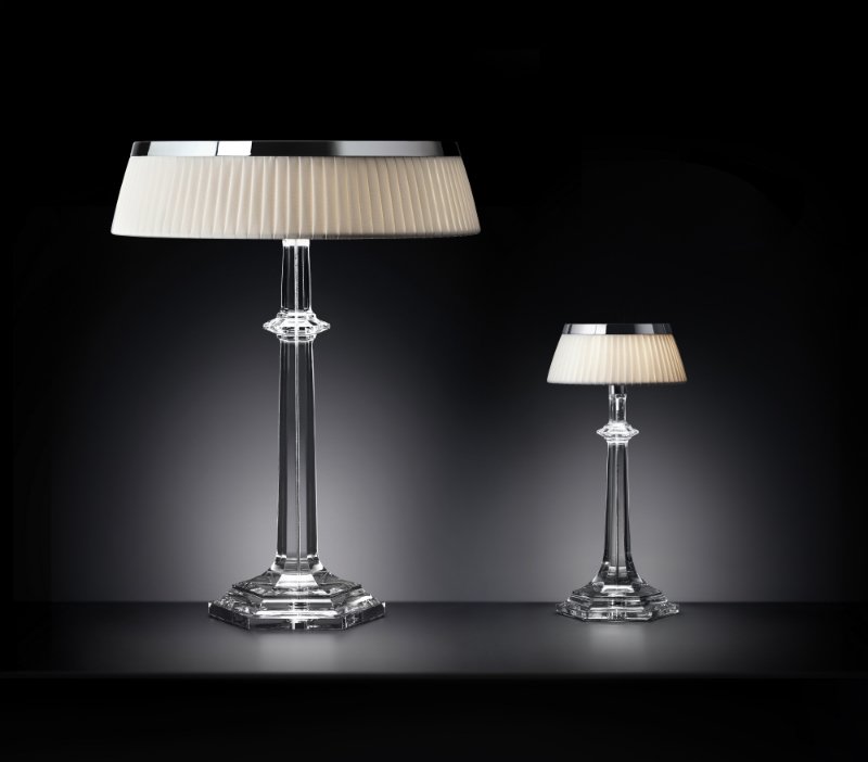 The BON JOUR VERSAILLES lamp sits on top of a finely sculpted transparent crystal or polymethacrylate stand whose lines are reminiscent of the Maison Baccarat most iconic pieces. Crowned with a chrome plate, the lamp features a unique and innovative LED Edge Lighting technology developed by Flos. This revolutionary system, coupled with an elegant lampshade in pleated fabric, allows the diffusion of warm and organic light that reveals spaces, thanks to an infinite optical play, and like a reflection of magical transparency, the lamp, bathed in light, seems to come alive from the inside.