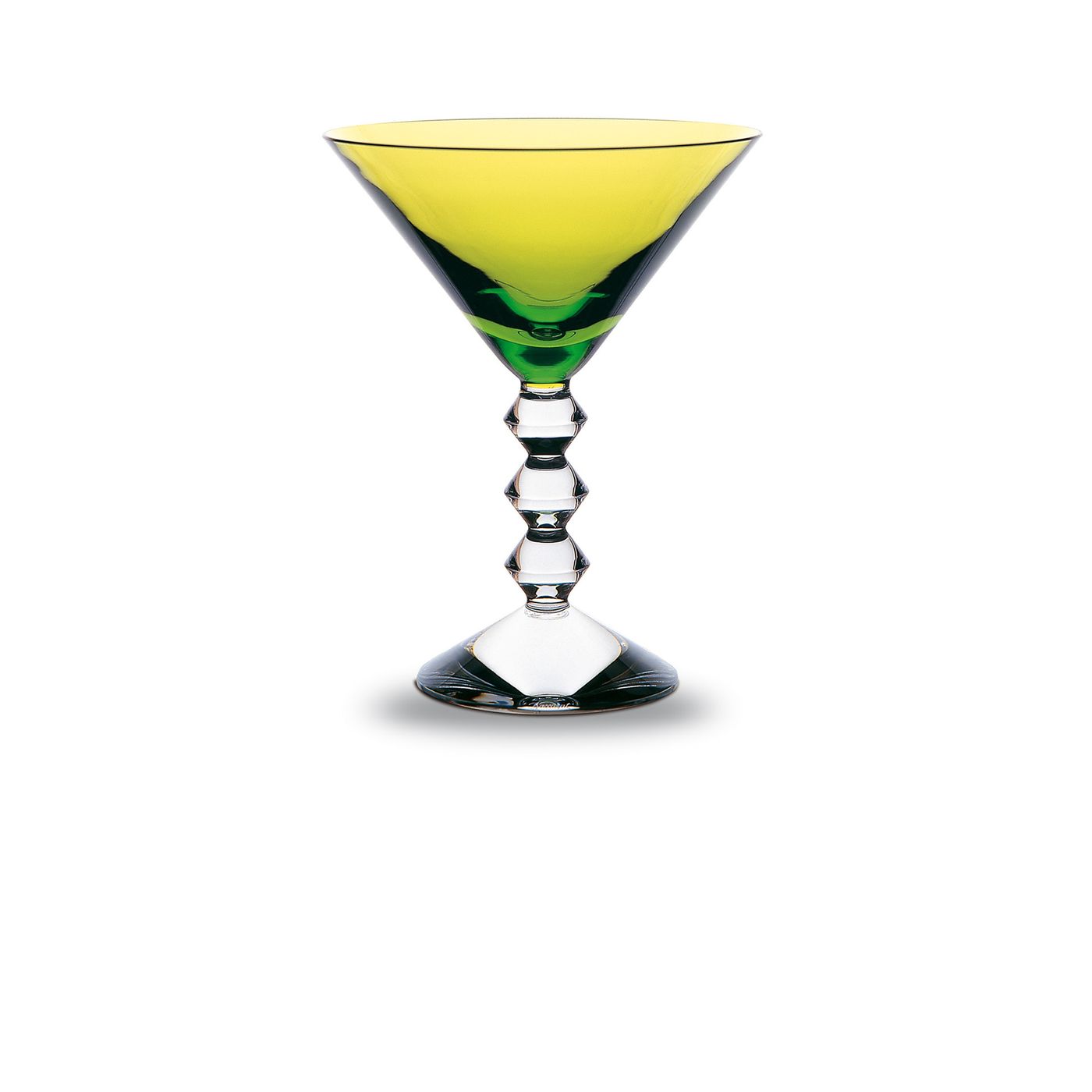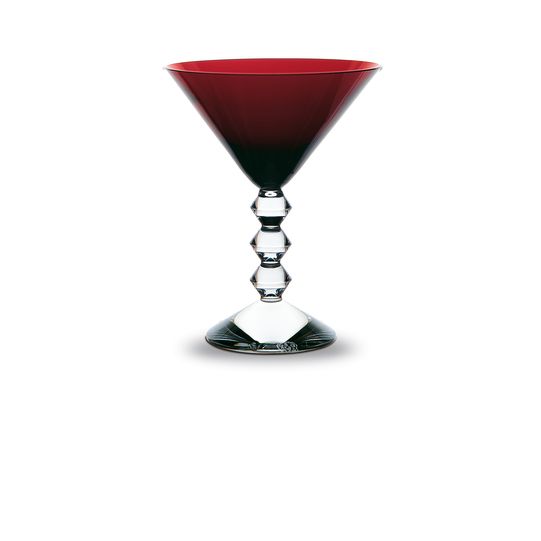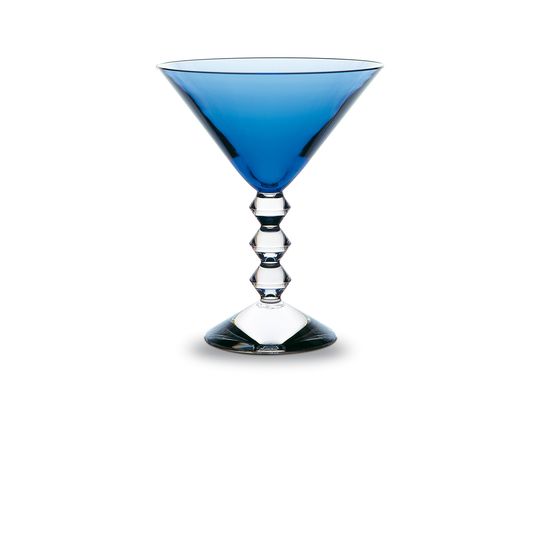 VEGA MARTINI GLASS BACCARAT, The geometric stem is eye-catching, a stack of three diabolo-shaped Baccarat crystal pieces resembling exquisite beads strung together or Brancusi’s geometric totems. The martini glass’s V-shaped upper half harmonizes with the zigzag of the bevel-cut stem, in this way creating a continuous, accentuated angularity. The Baccarat Clear crystal is available in three colorful alternatives, namely a bright blue sapphire crystal, a moss-green crystal with yellow undertones, and Baccarat’s signature sumptuous ruby crystal. The Vega collection, designed by Savinel & Rozé for Baccarat, also includes a champagne flute and other items for bar and tableware. Discover Vega Baccarat collection.