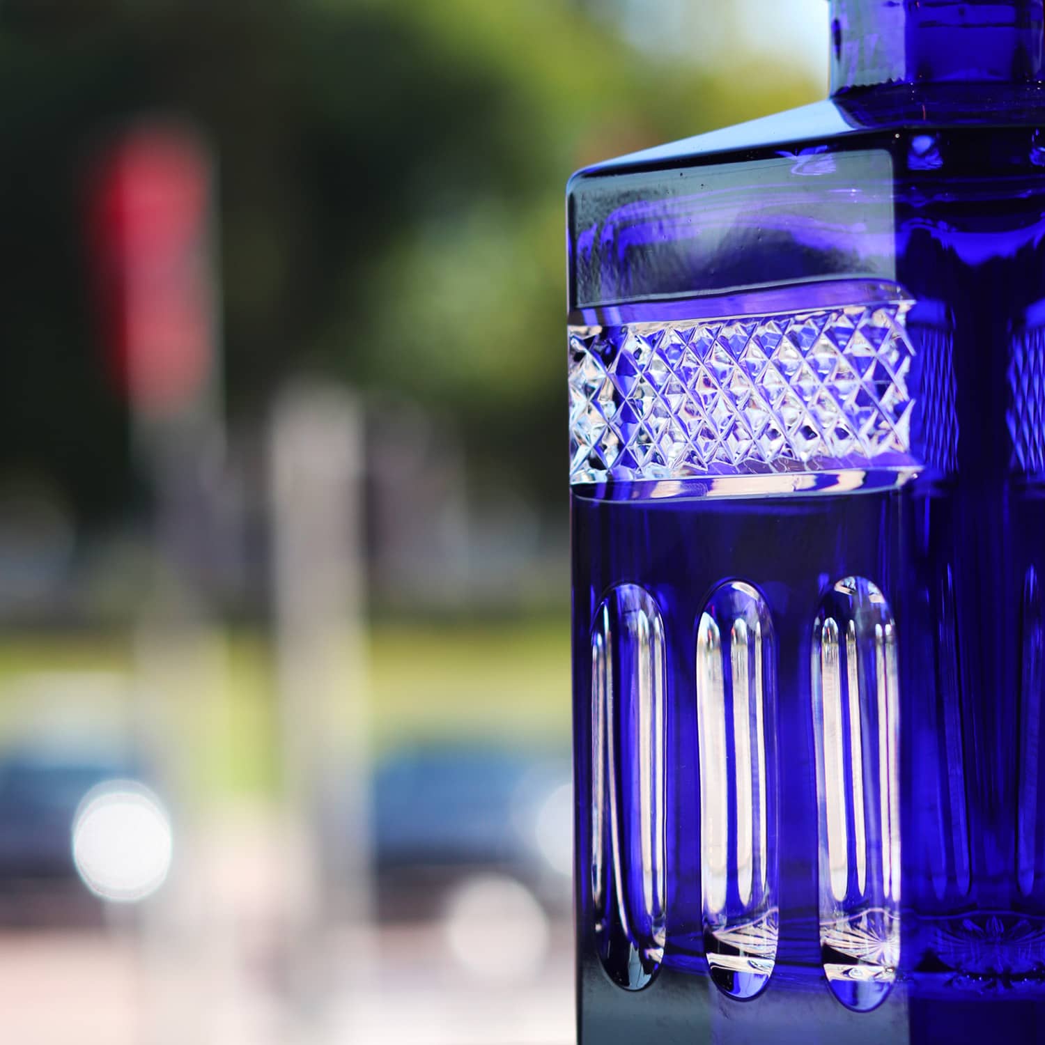 Discover Blue Whisky decanter Mireille. Beautiful decanter in crystal 18 % lead, mouth blown and hand cut. Crystal glass signed Cristal de Paris. Pure crystal , with a very specific size in order to reflect maximum light.