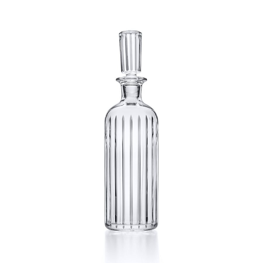 Consecutive parallel lines travel cleanly along the form, subtly grazing the Clear crystal bottle from its base to its shoulder. The lean stripes bring a textural quality to the surface, showcasing the three-dimensionality of the decanter and creating a visual depth to the whiskey within. The tall beveled stopper, which resembles a stately top hat, adds linear emphasis. The vertical sweep of the striping is also present on other pieces of the Harmonie collection, which includes highballs and tumblers. All of these pieces complement a well-stocked bar for the smoothest of drinking experiences.
