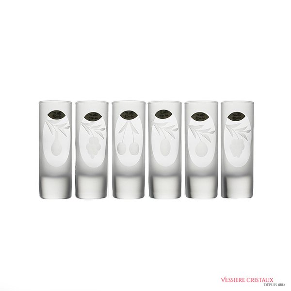 CUT CRYSTAL SHOOTERS, Handcrafted by craftsmen in a workshop located in Lorraine (France), each glass is hand cut, presenting 6 different designs. A French manufacturer, made near Sarrebourg.