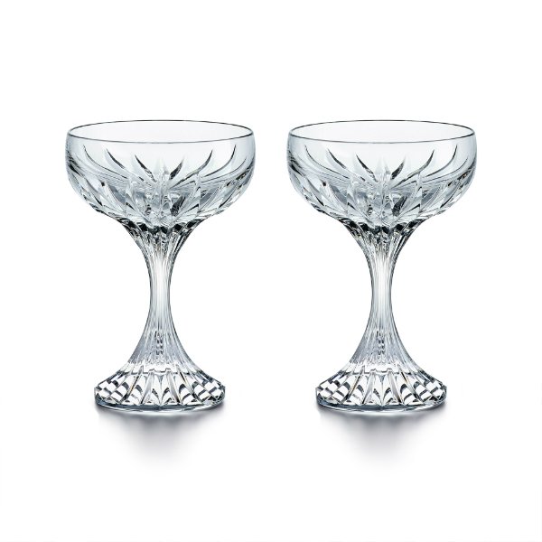MASSENA – CHAMPAGNE COUPE X2 BACCARAT, Deep orgue bevel cuts are etched directly into the Clear crystal, irradiating from the foot of the glass to the base of the narrow bowl. This, in turn, puts the flute’s smooth upper half in sharp relief. The intricate detailing gives the Massena glass the appearance of impressive heft, as if it were a modern-day chalice. The polished silhouette and prismatic qualities make it worthy of any festive occasion or special soirée. The champagne flute is just one component of the Massena bar and tableware collection, which encompasses wine glasses, highball glasses, tumblers, and a decanter. All pieces from the Massena collection share a scrupulously textural quality. Discover Massena Baccarat collection.
