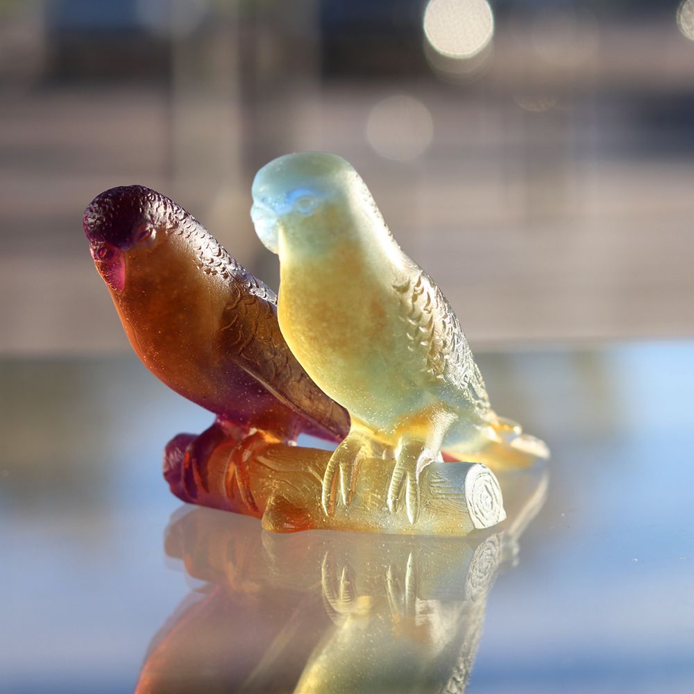 BUDGERIGARS COUPLE AMBER DAUM, signed Daum France. Every Daum piece has a unique and distinctive character, thanks to the brilliance of crystal and the intensity of the colors.