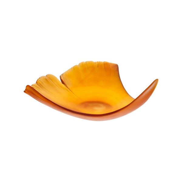 LARGE AMBER LEAF DAUM, For September, the Maison Daum presents the Ginkgo collection in amber. This colour was inspired by the autumn leaves of Ginkgo, as they turn into beautiful golden yellow leaves that persist for several weeks. When the leaves fall, they form a golden carpet around the tree.