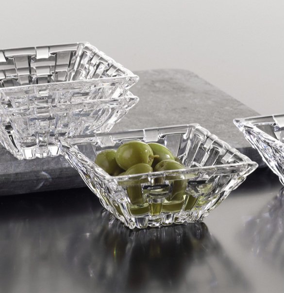 Olives, appetizers, ice cream, this crystal square small cup Bossa Nova will be of great use ! Its unique, chic and contemporary texture will bring luxury to your aperitif, to enjoy exceptional moment. These small bowls can also be use as decorative element, to be combined with the Bossa Nova square plate.