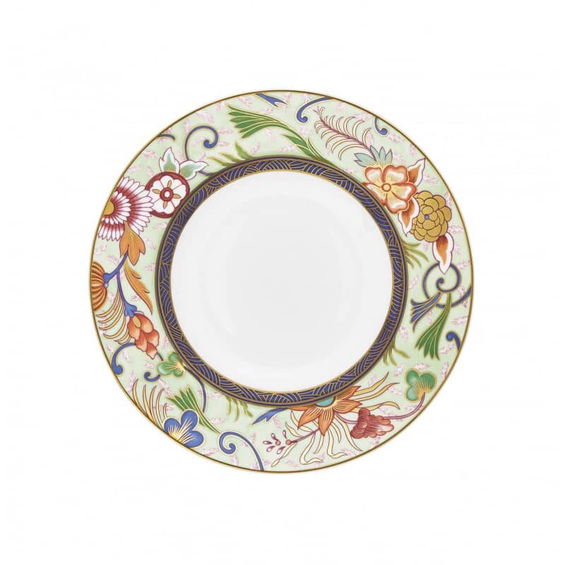The Imari collection pays homage to the sumptuous Japanese porcelain created on the island of Kyushu. Adorned in cobalt blue and iron red, they celebrate Japanese floral art by skillfully combining plant and mineral elements. This elegant reinterpretation subtly illustrates the contrast between the delicate geometric motifs of the border and the light and poetic watercolor composition that adorns its center.