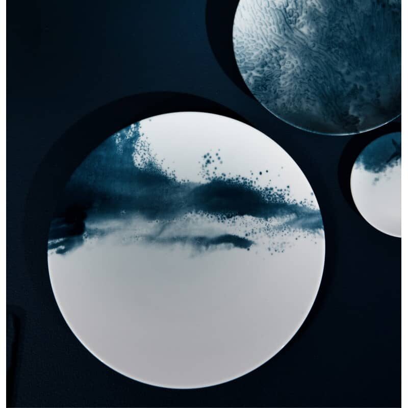 Born from the collaboration between artist Aurore de la Morinerie and Maison Raynaud, the Abysses collection reveals all the poetic and mysterious power of the ocean depths. Each Limoges porcelain piece reveals a unique design, where deep indigo blues blend gracefully into the immaculate whiteness of the porcelain, evoking marine plains and abyssal chasms of captivating beauty.