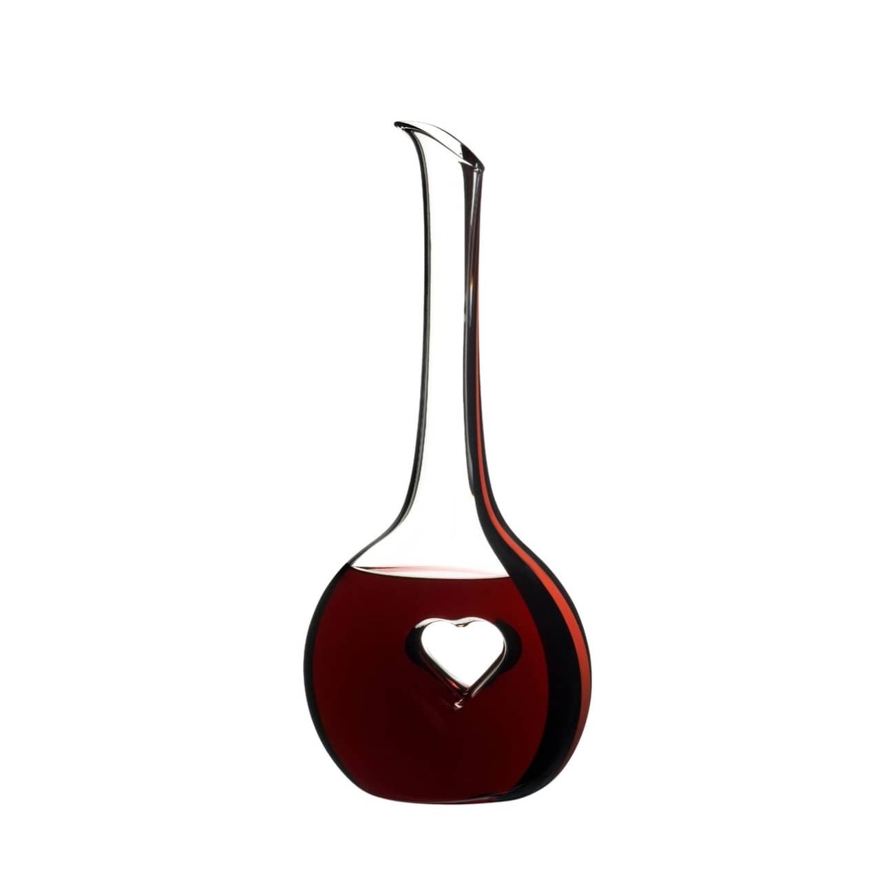 The Black Tie Bliss decanter exemplifies this tradition of innovation with its emotive shape and technical sophistication designed to enhance aromas. The embossed heart, the signature of this piece, is more than just an ornament: it guides the flow of the wine, increasing the surface area in contact with the air, for faster aromatic development. Its two-tone design is born from a rare gesture, where a black and red crystal cane is fused to the molten glass, giving the object a strong and unique visual identity.